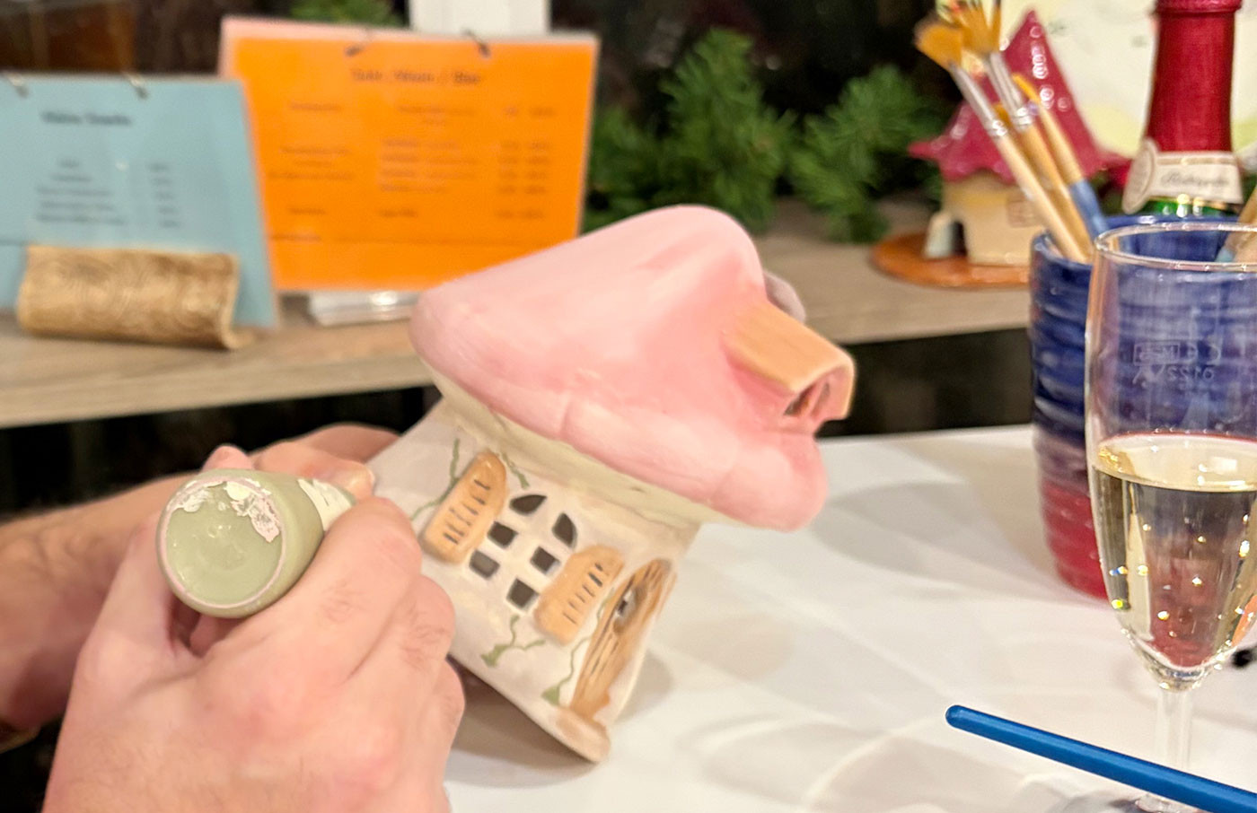 Der Ablauf ist herrlich einfach: Man sucht sich ein fertiges Keramikstück aus (von der klassischen Tasse bis zur außergewöhnliche Vase oder einem witzigen Teelichthäuschen) und bemalt es nach Herzenslust. Später wird es gebrannt und zwei Wochen später hält man sein persönliches, glasurglänzendes Meisterwerk in den Händen.