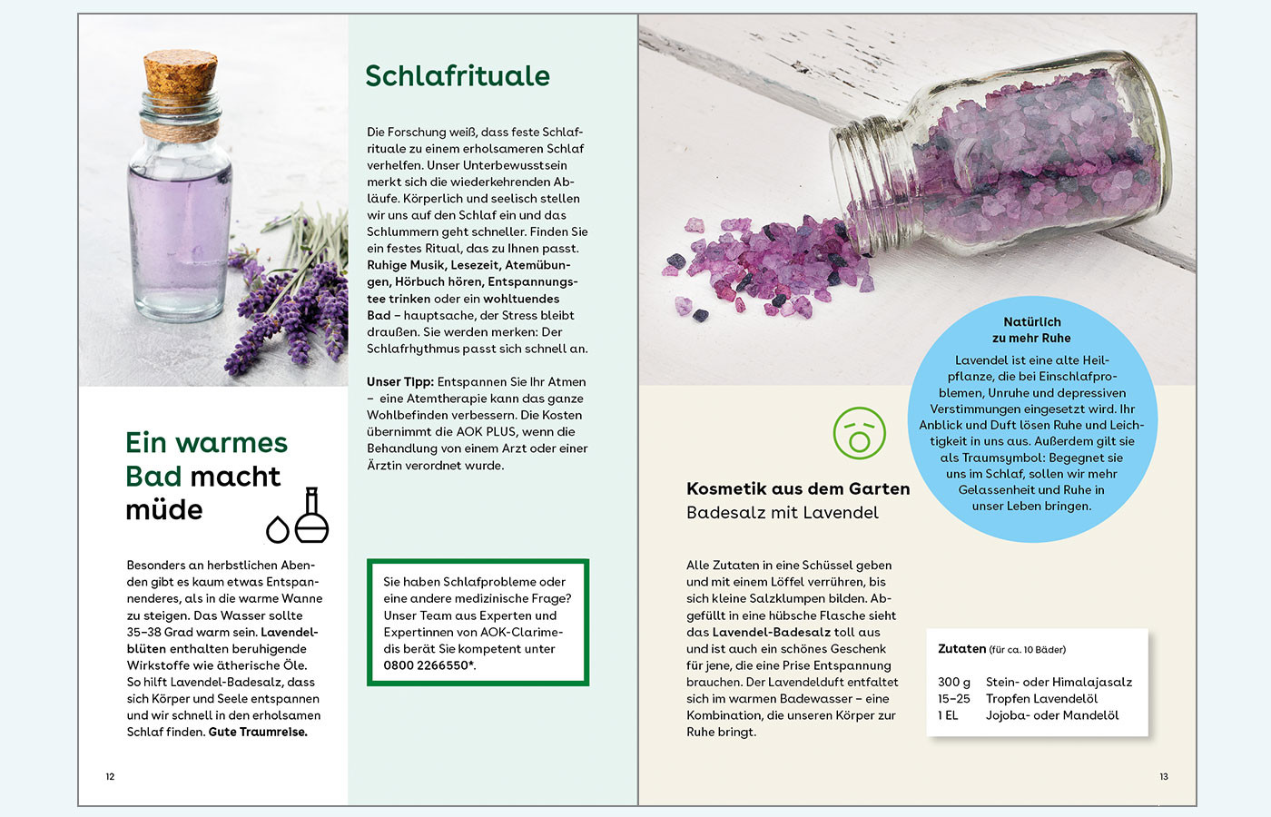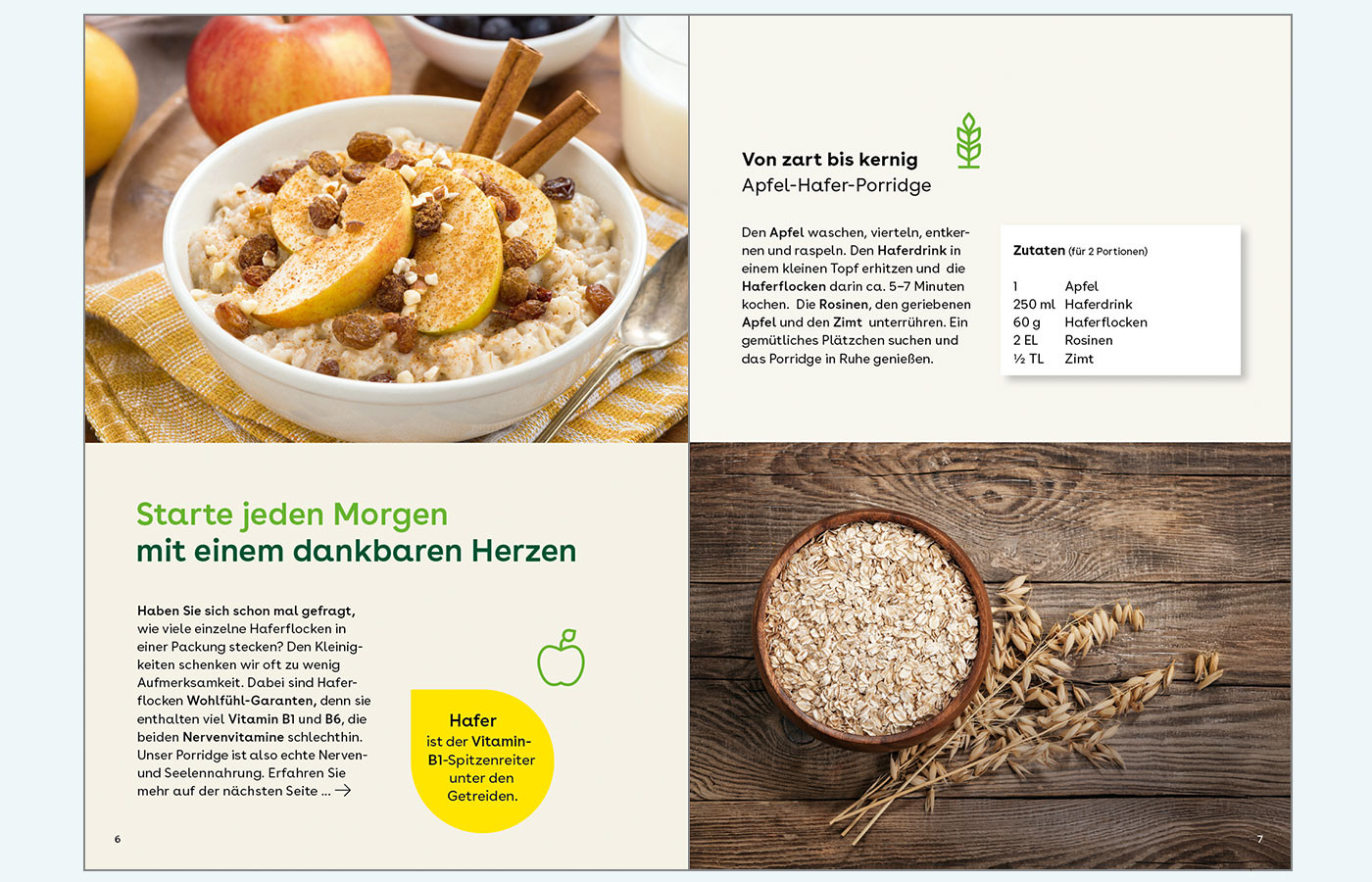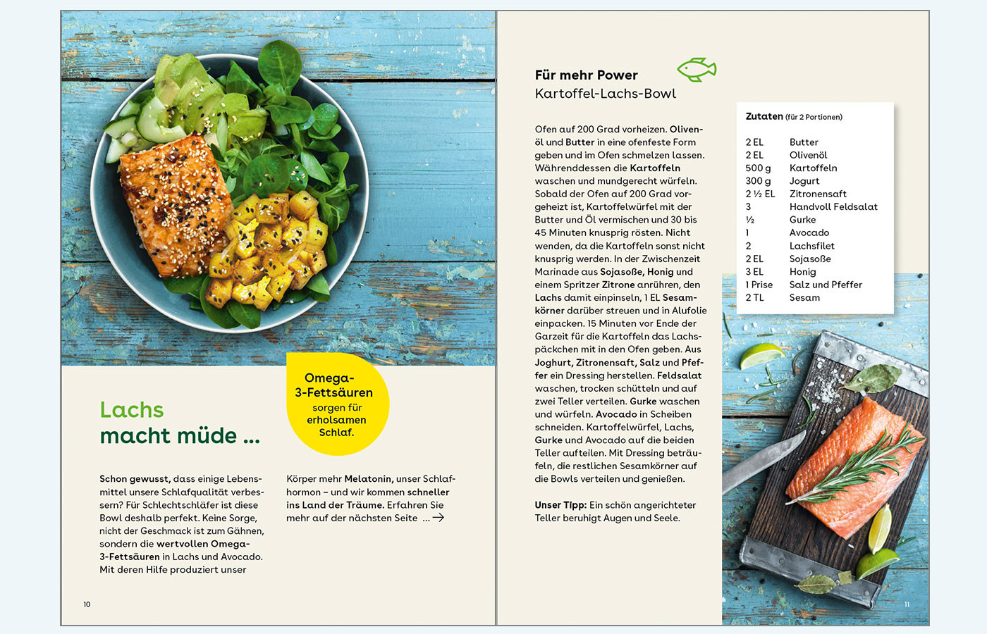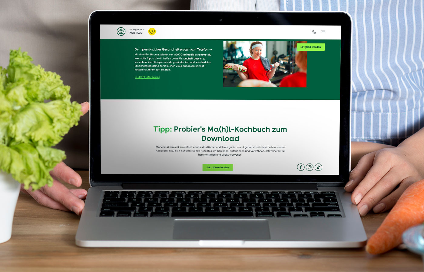 In meiner Rolle als Grafikerin durfte ich das neue Corporate Design der AOK PLUS in diesem Rezeptbuch visuell umsetzen. Dabei arbeitete ich mich in das neue CD ein und nutzte das Brand-Portal mit den hinterlegten Assets wie Logos, Icons, Illustrationen und Bildern. Außerdem griff ich für den Wiedererkennungswert die drei Kampagnenmotive der Gesundheitsinitiative auf und wählte sorgsam passendes Stockmaterial aus.