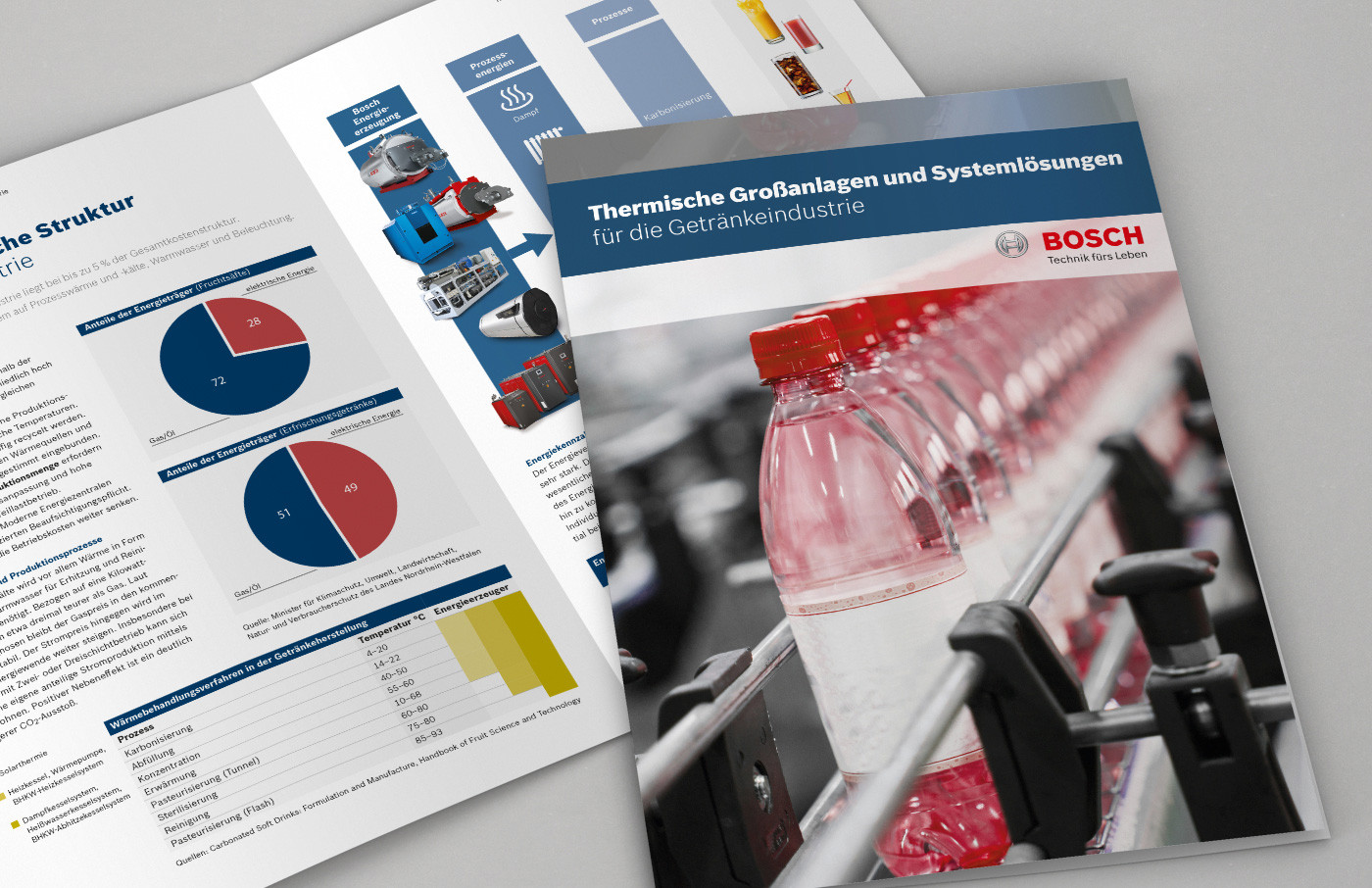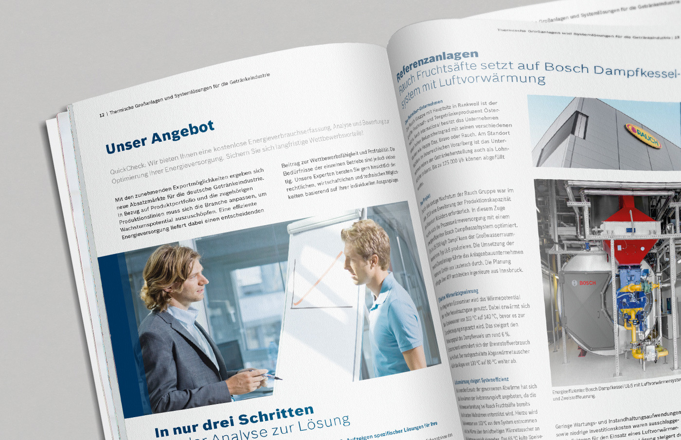 Erstellung einer 16-seitigen BOSCH-Broschur zum Thema “Nachhaltige und kosteneffiziente Lösungen bei der Wärme- und Energieversorgung für die Getränkeindustrie”.