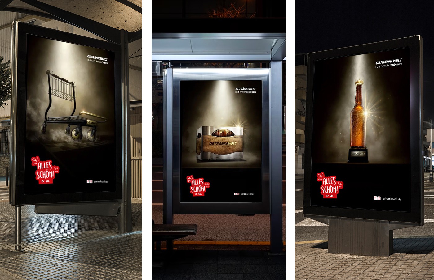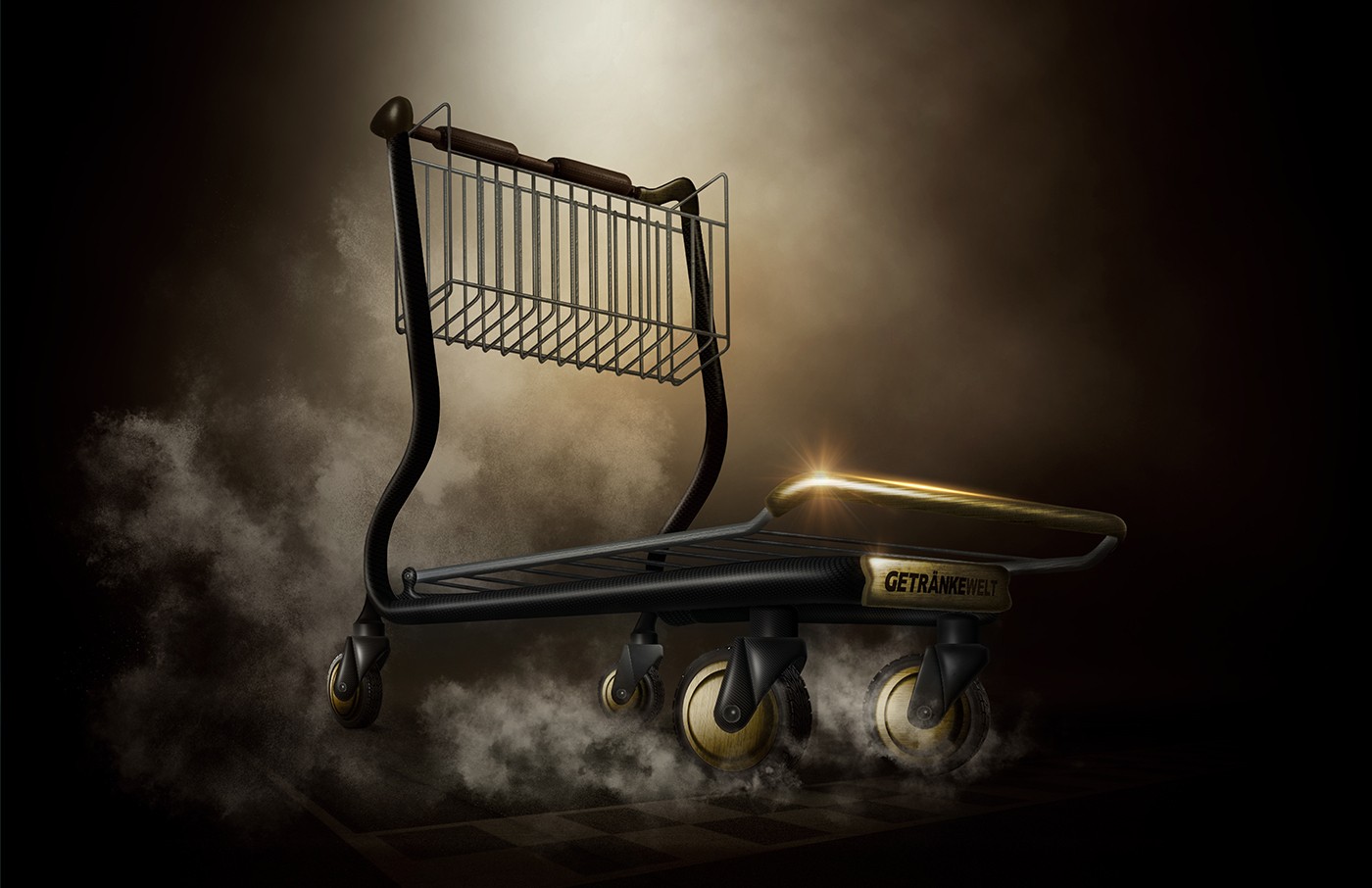 Die Kampagne spricht für sich: Wir haben gezielt auf den Sehsinn gesetzt und mit Formen, Farben und Strukturen intensive visuelle Reize geschaffen. Drei Hauptelemente standen dabei im Fokus: die Bierflasche, der Bierkasten und der Einkaufswagen. Die Bierflasche stellt dabei die (Aus-)Beute dar und wurde als Pokal visualisiert. Der Bierkasten ist eine Art Gewicht, denn Mann trägt den Kasten selbst bzw. gleich zwei Kästen auf einmal. Und der Einkaufswagen als schnelles Fahrzeug steht für Männlichkeit, Freiheit und Geschwindigkeit. Durch diese gezielte Inszenierung haben wir es geschafft, Informationen zu vermitteln und gleichzeitig Gefühle bei der Zielgruppe zu wecken.