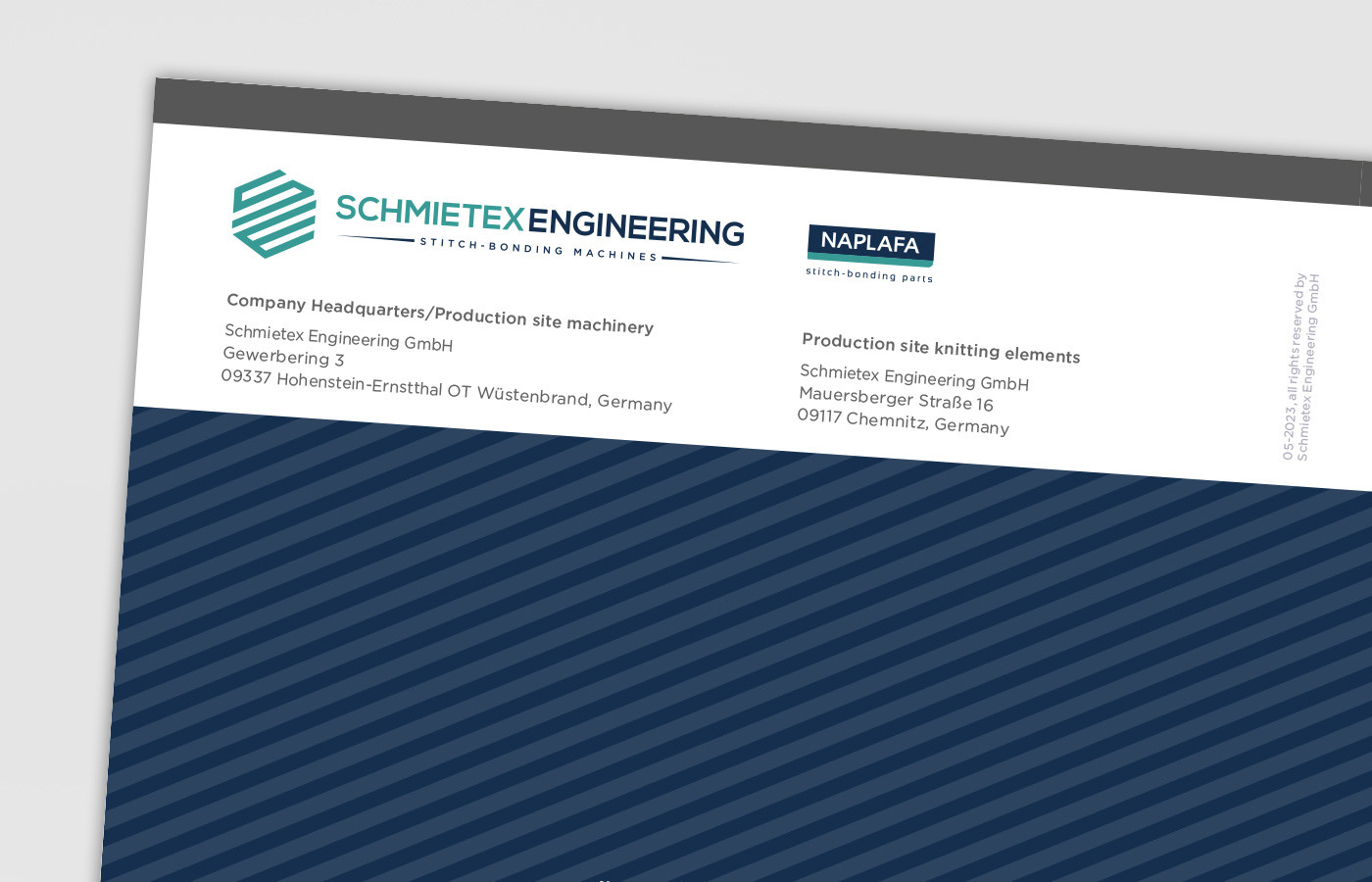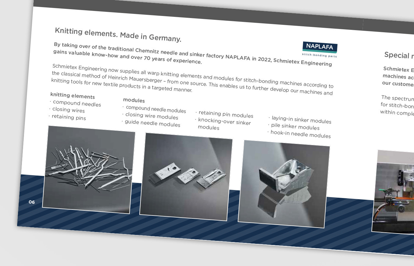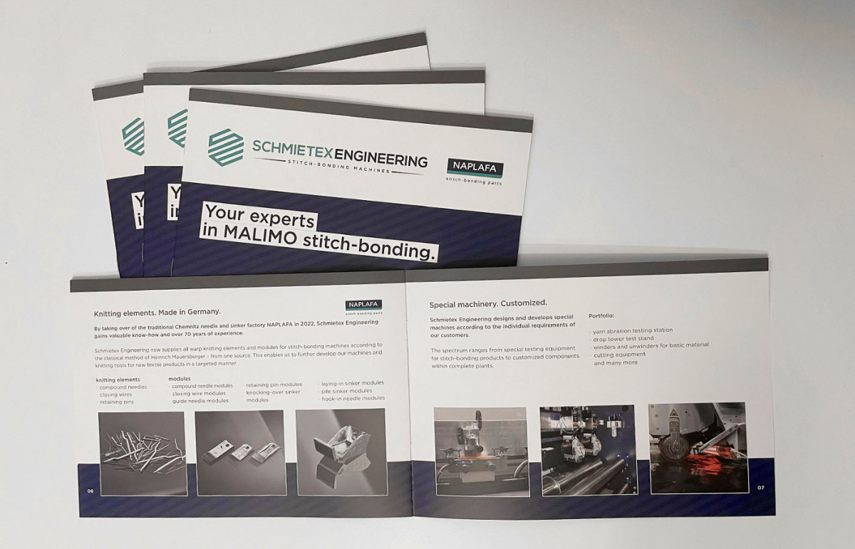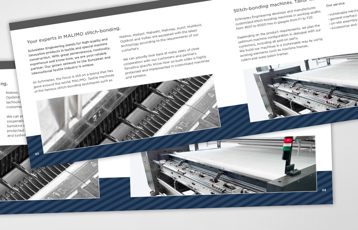 Für das international tätige Unternehmen Schmietex, spezialisiert auf generalüberholte Nähwirkmaschinen seit 1995, entstand eine Broschüre, die jahrzehntelange Erfahrung, technische Kompetenz und nachhaltiges Wirtschaften in eine verständliche, visuell strukturierte Form bringt.