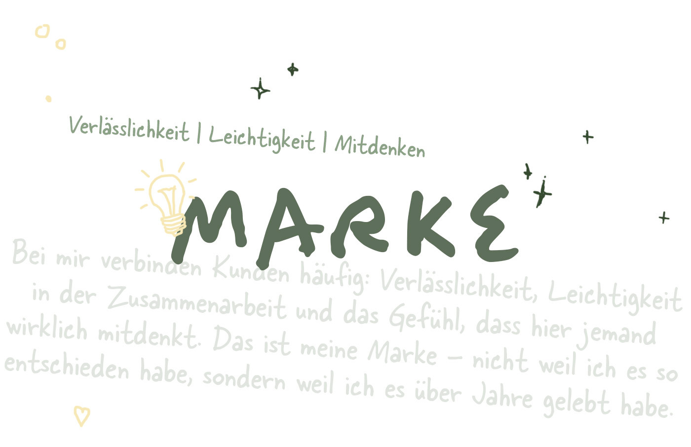 Die Marke ist mehr als ein hübsches Logo oder eine bestimmte Farbe. Sie ist das Gesamtbild und Gefühl, das Menschen mit mir als Designerin verbinden. Was denkt jemand, wenn er meinen Namen hört? Welche Werte, welche Qualität, welche Energie assoziiert er damit? All das zusammen, das bin ich als Marke. Sie lebt nicht nur auf meiner Website, sondern in den Köpfen und Herzen meiner Kund:innen.