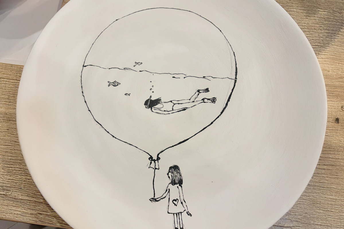 Und ich selbst? Ich habe mich dieses Mal an eine surreale Gestaltung gewagt. Erst drei Schichten Weiß, quasi Keramik-Grundierung deluxe, und dann ging es mit einer schwarzen Spritzflasche weiter, deren Öffnung so klein war wie eine Stecknadel. Zeichnen mal anders, aber unfassbar meditativ.