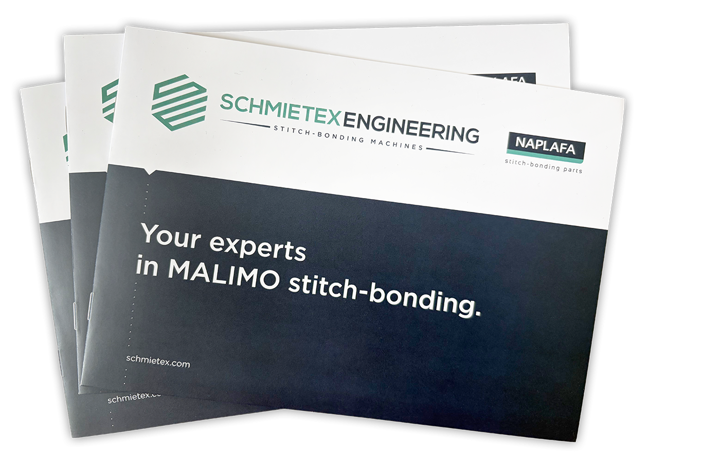 Internationale B2B-Verkaufsbroschüre für Schmietex Engineering und Naplafa: Über 70 Jahre Know-how im MALIMO Stitch-Bonding klar und substanziell auf Englisch kommuniziert – technische Kompetenz, Service und Positionierung als verlässliche Partner in der Textilindustrie.