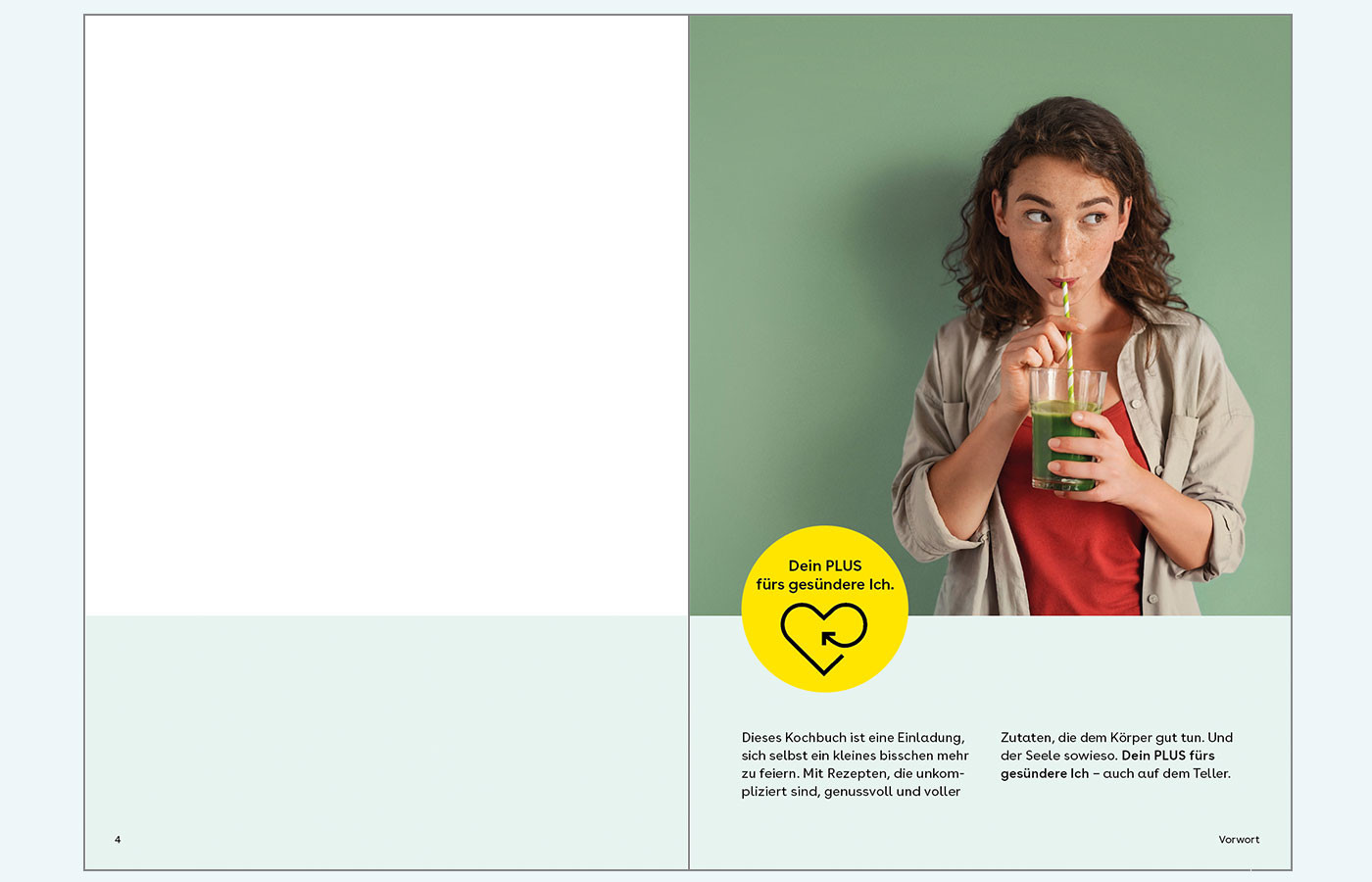 In meiner Rolle als Grafikerin durfte ich das neue Corporate Design der AOK PLUS in diesem Rezeptbuch visuell umsetzen. Dabei arbeitete ich mich in das neue CD ein und nutzte das Brand-Portal mit den hinterlegten Assets wie Logos, Icons, Illustrationen und Bildern. Außerdem griff ich für den Wiedererkennungswert die drei Kampagnenmotive der Gesundheitsinitiative auf und wählte sorgsam passendes Stockmaterial aus.