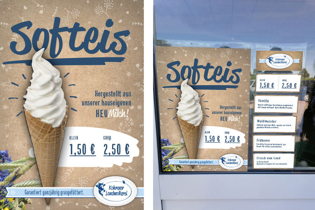 Ein besonderes Highlight: das Keyvisual für das Softeis-Ausgabefenster und die Eistruhe mit köstlichem, abgepacktem Eis in verschiedenen Sorten. Ein Projekt, das Genuss und Design harmonisch verbindet.