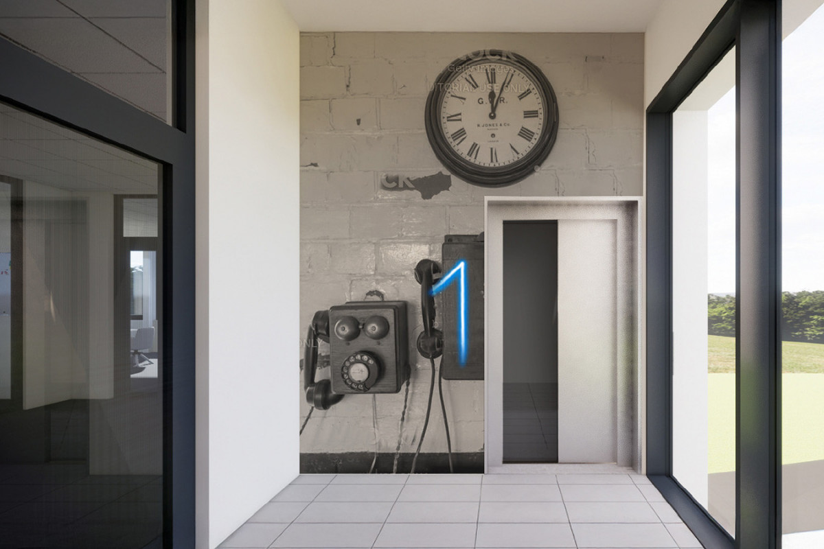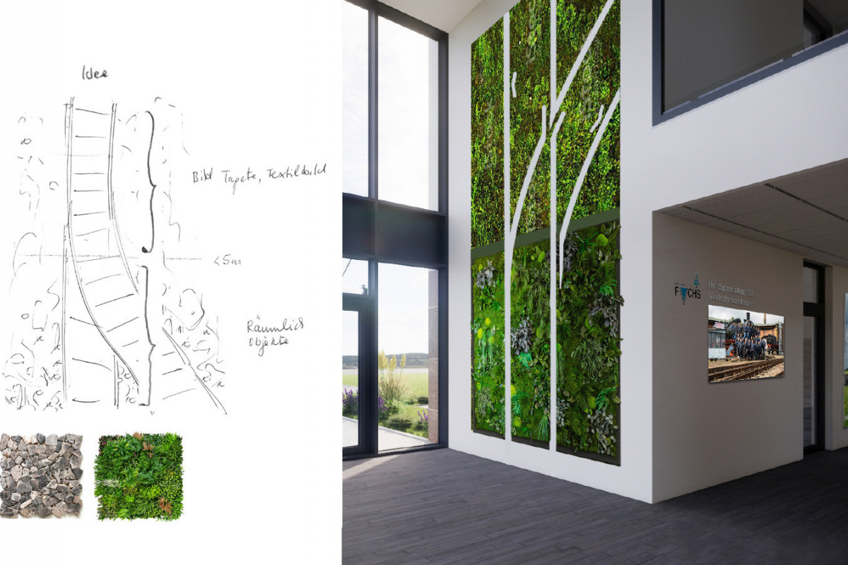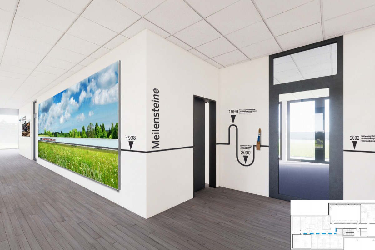 Die Besucher tauchen bereits im Eingangsbereich in das Fachgebiet des Unternehmens ein und werden von einer beeindruckenden, acht Meter hohen Schiene empfangen, die aus einem natürlichen Moosbett herausragt. Am Empfangstresen setzt eine fahrende Miniatureisenbahn einen spielerischen Kontrast zur industriellen Präzision. Die Geschichte des Unternehmens wird durch kreative Wandgestaltungen mit historischen Bildern, Schienenprofilen und Bauplänen erlebbar gemacht. Eine flexible Mitarbeiterwand rückt die Menschen hinter den Projekten in den Mittelpunkt und zeigt, dass Innovation von Persönlichkeiten lebt. Kommunikationszonen sind so gestaltet, dass sie den Austausch fördern – von einer alten DB-Sitzgruppe mit simulierten Bahnfenstern als Besprechungsraum bis hin zur zentralen Think Tank Area als Herzstück des Gebäudes. Typische Baustoffe, Farben und Motive aus der Welt von Fuchs verbinden die Räume zu einem stimmigen Gesamtkonzept, das visuell und haptisch die Identität des Unternehmens widerspiegelt.