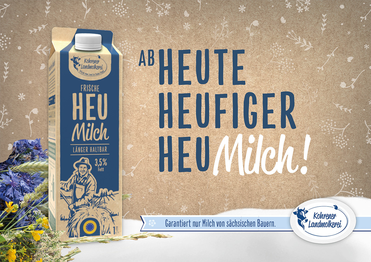 Die Kohrener Landmolkerei mit ihren Linien Bauernmilch und Heumilch bekamen 2020 ein neues Packaging-Design – erstmals seit vielen Jahren. Die Einführung des neuen Packaging-Designs soll nicht nur eine optische Veränderung, sondern auch Teil einer durchdachten Kommunikationsstrategie sein. Für die Agentur Dschoy hatte ich die Gelegenheit, in enger Zusammenarbeit eine Kommunikationsstrategie und ein mehrstufiges Konzept zu entwickeln.