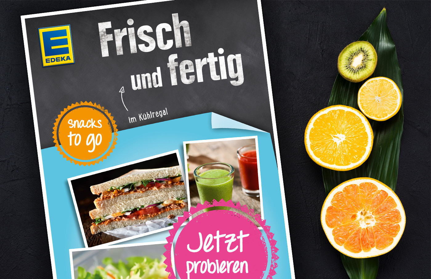 Eine lebendige Konzeption, welche sowohl begeistert als auch Appetit macht, stand im Fokus. YB-Design übernahm Satz/Layout & Bildbearbeitung eines EDEKA-Aufstellers und die Erstellung grafischer Elemente auf Handzetteln und Werbeaufstellern und Topschildern.