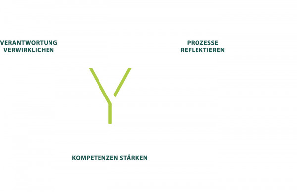Nun galt es, einen visuellen Charakter zu finden, der all das vereint. So entstand eine umrahmende, cleane Wortmarke mit einem herausgestellten "Y" für die drei wichtigen Aspekte: Verantwortung verwirklichen, Prozesse reflektieren und Kompetenzen stärken. Die Verbundenheit zu Mensch und Natur drückt sich ebenfalls in der Farbwelt aus und schafft ein harmonisches Gesamtbild. Der ergänzende Claim "Mit Menschen nachhaltig" bringt die Zielsetzung auf den Punkt.